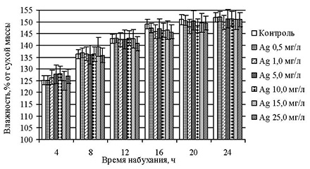 Процесс набухания необходим для активации ферментов и создания условий для биохимических реакций, так как сухие семена содержат только связанную воду [16]. В связи с этим, учитывая особую значимость процесса набухания, первоначальная задача заключалась в исследовании влияния различных концентраций нанобиосеребра на этот процесс (рис. 1).