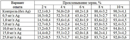 Как видно из результатов, приведенных на рисунке 1, значительное увеличение влажности семян наблюдалось до 16 ч во всех вариантах опыта, что соответствует максимальной ферментативной активности [17]. Таким образом, нанобиосеребро в концентрации 0,5-25,0 мг/л не оказывало угнетающего действия на процесс набухания семян. Результаты исследований показали, что нанобиосеребро в высоких концентрациях не оказывало ингибирующего действия на процесс проклевывания семян, что важно для технологии получении зернового хлеба в промышленных условиях (табл., рис. 2).
