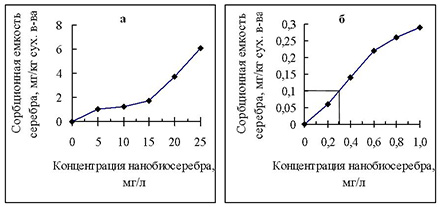 Рис. 3. Сорбционная емкость проклюнувшихся семян пшеницы в зависимости от концентрации нанобиосеребра: а) 0,2-1,0 мг/л (по серебру); б) 5,0-25,0 мг/л (по серебру).